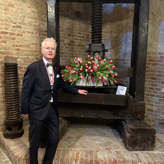 De volgende ochtend moesten wij al vroeg aantreden op het Castello Grinzane Cavour wegens de nodige voorbereidingen. Ondergetekende mocht in zijn hoedanigheid van Vice Maestro van de Nederlandse delegatie tijdens dit Capitolo een betoog houden met als titel “Tulpen als symbool van hoop, wedergeboorte, zuiverheid en onschuld”. Buiten het Castello verzamelden zich inmiddels Knights van verschillende landen en continenten, waar onder delegaties uit Hong Hong en uit Toronto. Traditiegetrouw woonden wij het unieke schouwspel bij van de vendelzwaaiers, trommelaars en trompettisten uit Alba, waarna wij onder getrommel begroet werden als Knights of Alba bij het plechtig betreden van de rode loper tot ons hoofdkwartier.