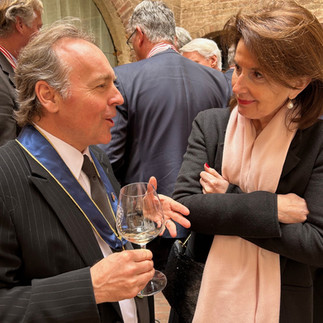 Na afloop van het ceremoniële gedeelte werd er een statiefoto van alle nieuwe Knights met de Grand Maestro in de Sala delle Maschere genomen en vond er op de binnenplaats een receptie plaats, waarbij er een Artura Bersano Metodo Classico brut 2018 werd geserveerd met talrijke amuses en konden de nieuw geintaleerde Knights gefeliciteerd worden. Aansluitend namen wij plaats in het Ristorante Al Castello van sterrenchef Alessandro Mecca. Nadat iedereen plaats had genomen en het eerste glas Langhe Doc Riesling L’Alman 2020 van Abbona Annamaria aan tafel geserveerd was, werd onder muzikale begeleiding op de gitaar door Secretaris Knight Harry Rek het lied "Tulipani di Amsterdam" gespeeld en welke door onze Nederlandse Knights uit volle borst werd gezongen.