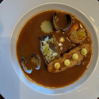 Na een korte intermezzo ging Noël verder met de toelichting van het tussengerecht; gereserveerd in een mooi soepbord zeevis, kabeljauw, garnaal en kokkels met een krokant en rouille, waarover een dunne bouillabaisse werd geschonken. Hierbij werden twee bijzondere wijnen gepersenteerd; een Riesling uit de Moezelstreek van Weingut Markus Molitor en een Chardonnay van de Zwitserse wijnmaker Thomas Marugg. Een zeldzame smaakbelevenis vormden beide wijnen bij dit bijzondere tussengerecht.